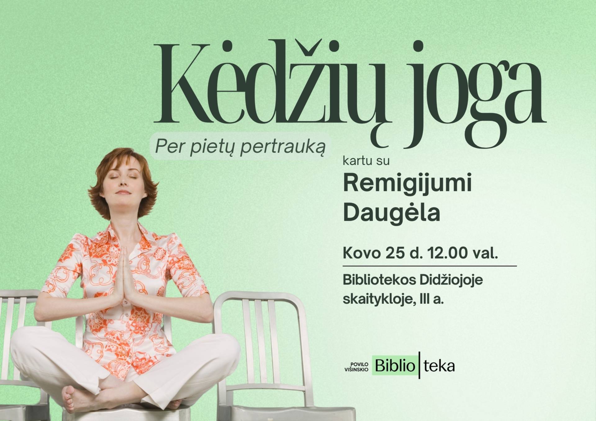 Kovo 25 d. 12.00 val. Povilo Višinskio bibliotekos Didžiojoje skaitykloje vyks kėdžių jogos užsiėmimas su Remigijumi Daugėla.