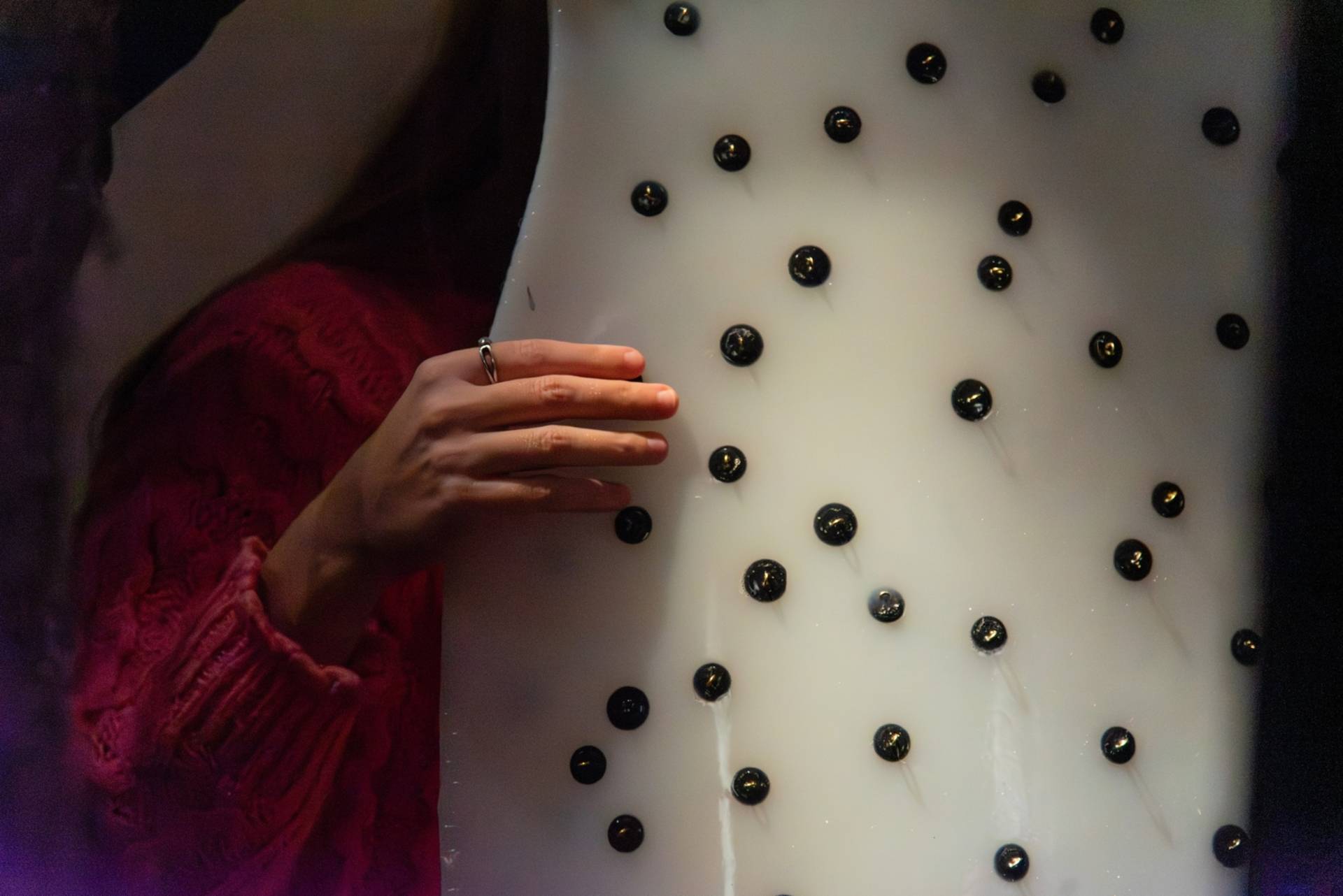 Parodoje mada atsiskleidžia ne kaip vizualus objektas, bet kaip pojūtinė patirtis. Drabužis čia nėra tik matomas – jis patiriamas per prisilietimą, judesį, garsą ir kvapą. Lankytojas kviečiamas ne tik stebėti, bet ir įsitraukti: liesti audinius, klausytis jų skleidžiamų garsų, sekti kvapų kuriamą atmosferą. Tokiu būdu kūriniai tampa ne statiškais eksponatais, o įvykiais, kurie kiekvienam lankytojui atsiskleidžia individualiai.