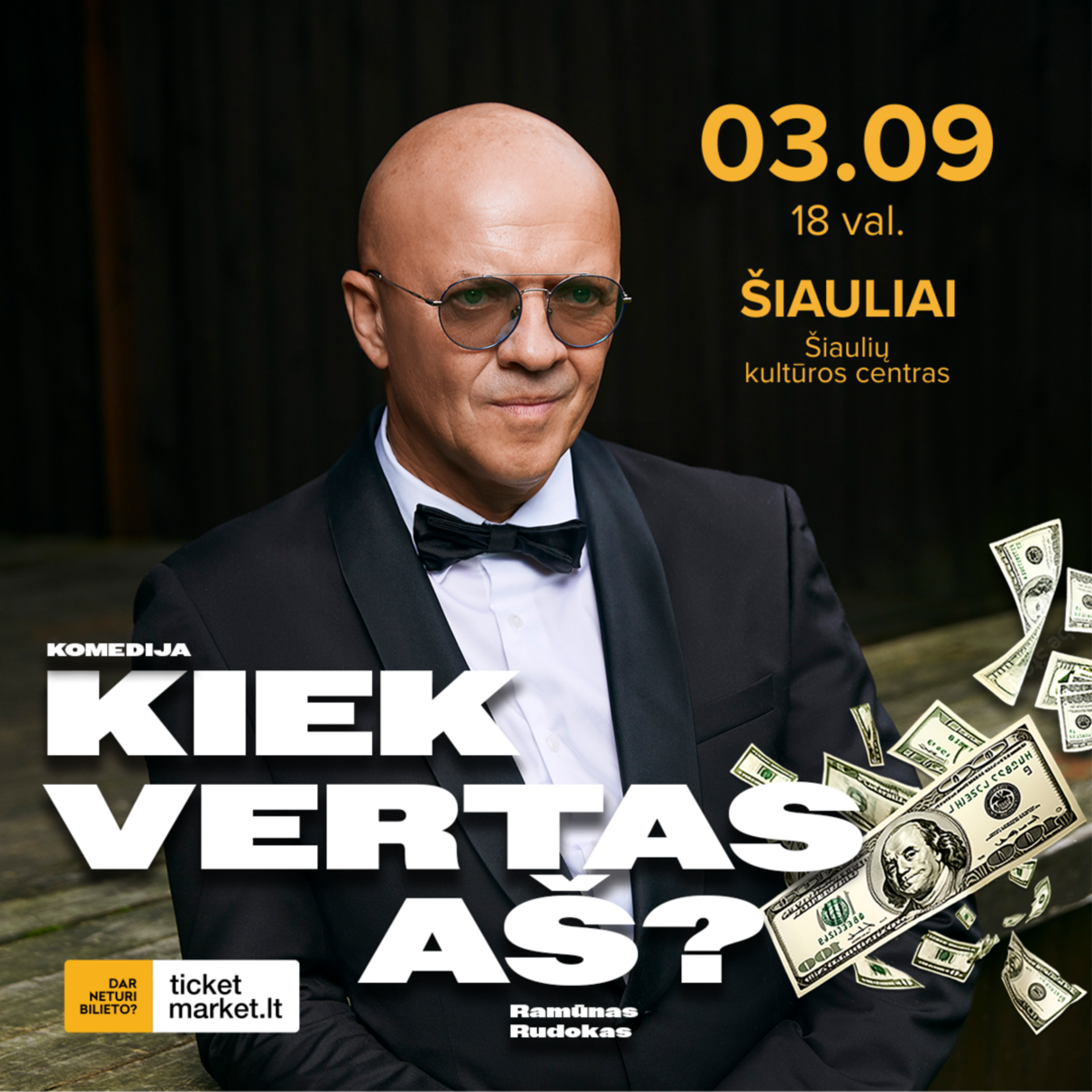 2026 m. kovo 9 d. 18 val. Šiaulių kultūros centro Didžiojoje koncertų salėje vyks Ramūno Rudoko komedija „Kiek vertas AŠ“.