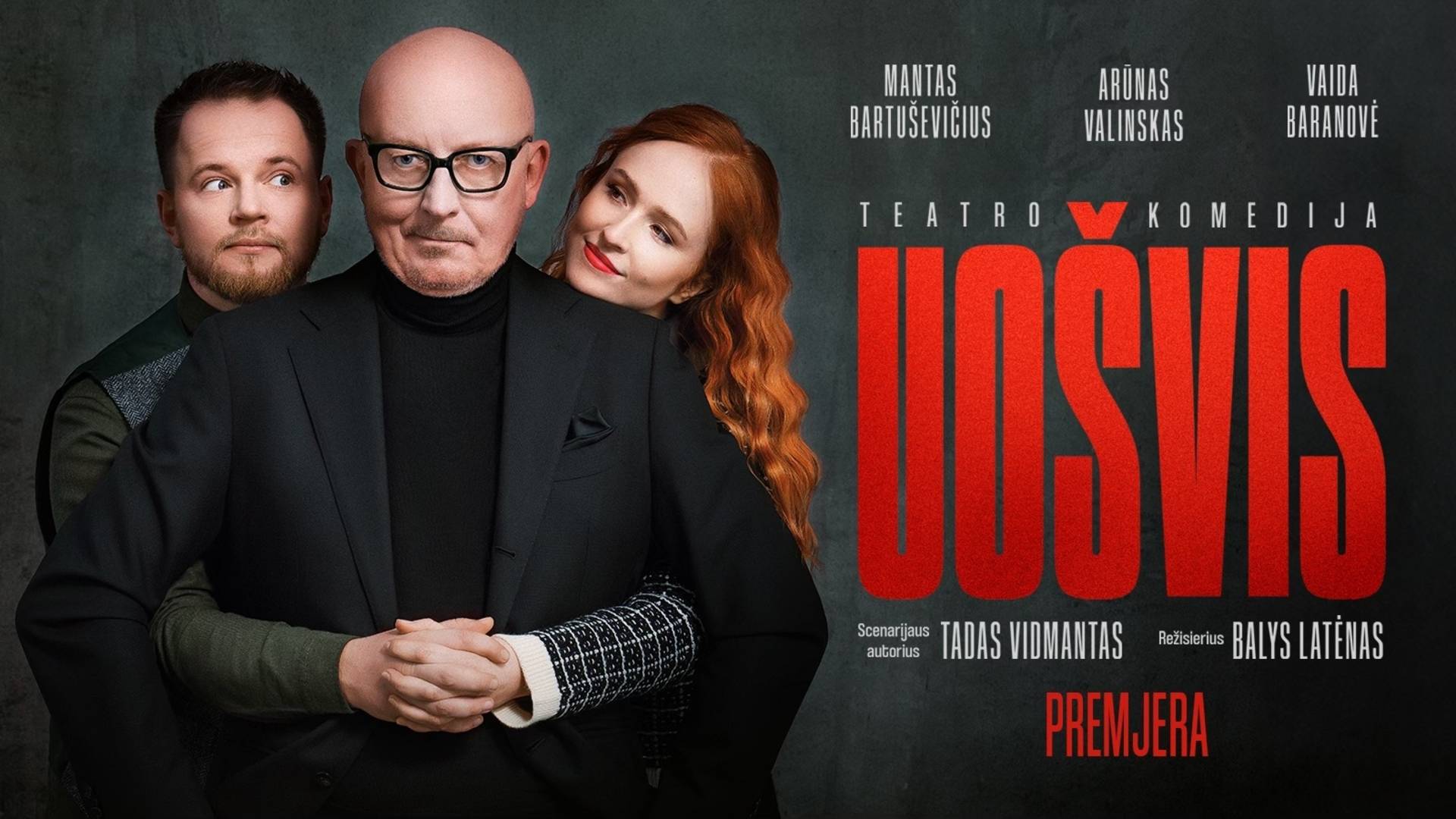 Legendinis šoumenas Arūnas Valinskas grįžta į teatro sceną! Vienas garsiausių šalies stand-up comedy meistrų Mantas Bartuševičius joje debiutuoja. O talentingoji aktorė Vaida Baranovė stoja tarp šių vyrų ir jau tuoj taps mėgstamiausia raudonplauke šalyje. Šią kompaniją jau netrukus išvysite naujoje teatro komedijoje „Uošvis“. Scenarijaus autorius – Tadas Vidmantas, spektaklį režisuoja ne vieną teatro aikštelių hitą sukūręs Balys Latėnas.